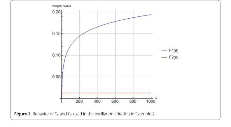 Similarly, in Example 3, for DE (44), they used their Corollary 1 to establish oscillation. They then challenged Theorem 1 from Althubiti et al. [25] with the same equation. By computing $\sum_{j=1}^K \int_{s_0}^\infty \frac{q_j(\theta) \mu_j^{3\delta}(\theta)}{\theta^{3\delta}} d\theta = \int_{s_0}^\infty \frac{q_0 (\theta/4)^3}{\theta^3} d\theta$, they showed that this integral also did not diverge to infinity, failing condition (6) of Theorem 1. Again, their criterion provided a conclusive result where the baseline failed. Figure 2 further reinforced this by showing the unbounded growth of $F_1(\theta)$ compared to the finite behavior of $F_2(\theta)$ and $F_3(\theta)$ for this example.