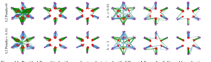 Figure 14. Rectified flows fitted with neural networks trained with different L2 penalty (left), and kernel esti- mator with different bandwidth h (right). π0: red dots; π1: purple dots