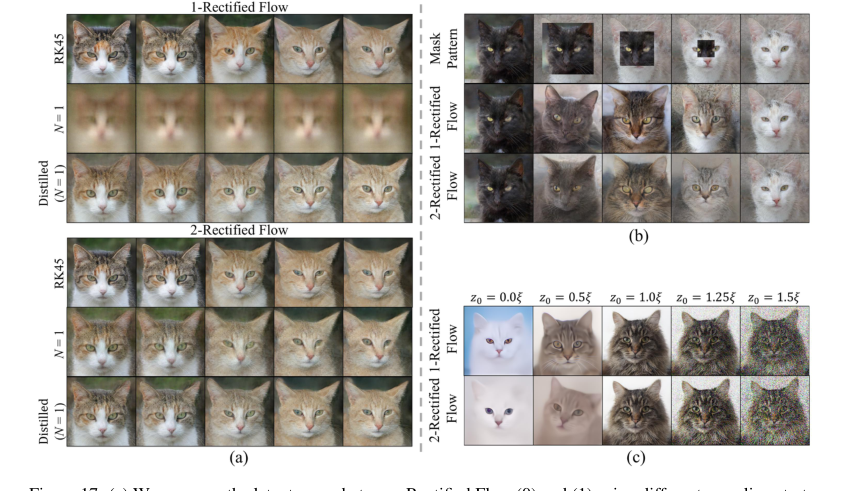 Figure 17. (a) We compare the latent space between Rectified Flow (0) and (1) using different sampling strate- gies with the same random seeds. We observe that (i) both 1-Rectified Flow and 2-Rectified Flow can provide a smooth latent interpolation, and their latent spaces look similar; (ii) when using one-step sampling (N = 1), 2-Rectified Flow can still provide visually recognizable interpolation, while 1-Rectified Flow cannot; (iii) Dis- tilled one-step models can also continuously interpolate between the images, and their latent spaces have little difference with the original flow. (b) We composite the latent codes of two images by replacing the boundary of a black cat with a white cat, then visualize the variation along the trajectory. The black cat turns into a grey cat at first, then a cat with mixing colors, and finally a white cat. (c) We randomly sample ξ ∼N(0, I), then generate images with αξ to examine the influence of α on the generated images. We find α < 1 results in overly smooth images, while α > 1 leads to noisy images