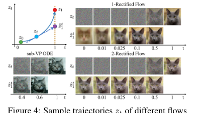 Figure 4. Sample trajectories zt of different flows on the AFHQ Cat dataset, and the extrapolation ˆzt 1 = zt + (1 −t)v(zt, t) from different zt. The same random seed is adopted for all methods. The ˆzt 1 of 2-rectified flow is almost independent with t, indicating that its trajectory is almost straight