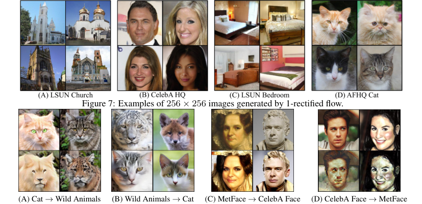 Figure 9. Samples of results of 1- and 2-rectified flow simulated with N = 1 and N = 100 Euler steps. Experiment settings We set the domains π0, π1 to be pairs of the AFHQ (Choi et al., 2020), MetFace (Karras et al., 2020) and CelebA-HQ (Karras et al., 2018) dataset. The results are shown by initializing the trained flows from the test data. The training and network configurations follow Section 3.1. See Appendix E for details