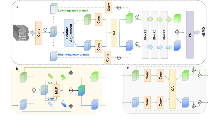 If a deep learning model memorizes the overall brightness (low-frequency data) at 120 kVp, it will fail miserably at 80 kVp. However, the fine, sponge-like trabecular structure of the bone (high-frequency data) remains physically stable regardless of the voltage. The authors designed a brilliant dual-branch neural network that splits the image into low and high frequencies, dynamically weighs their importance, and fuses them back together.