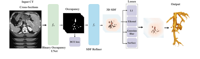 Figure 1. Overview of VesselSDF, our two-stage approach for vessel segmentation and reconstruction from CT scans. In the first stage, a 3D U-Net predicts a binary occupancy map. The second stage refines this occupancy into a signed distance field (SDF) using an additional 3D U-Net, guided by geometric regularization terms. The output 3D SDF, converted into a mesh, contains high-quality reconstructed vessels
