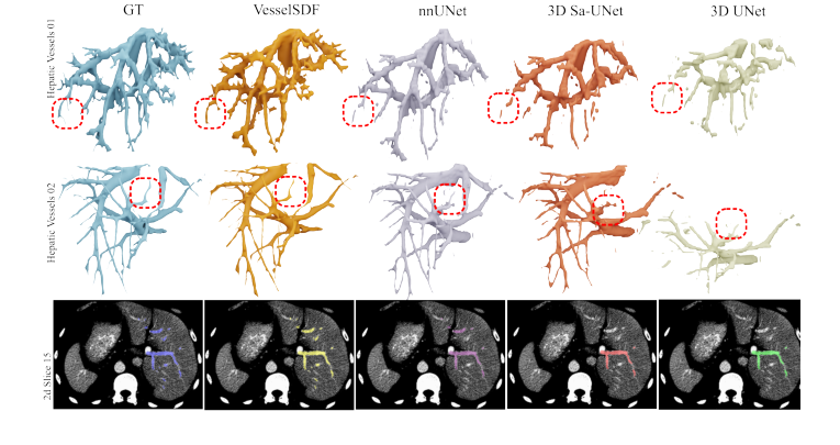 Figure 2. Qualitative 3D reconstruction results on the Hepatic Vessels dataset. The bottom row displays 2D slices highlighting the segmentation results
