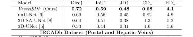 Table 1. Quantitative Results on the Hepatic Vessels and IRCADb datasets. Comparison of vessel reconstruction performance using different baselines. We report volume metrics (Dice Coefficient, Intersection over Union (IoU), and Jaccard similarity (JD)) and surface metrics (Chamfer distance (CD) ×100 and Hausdorff Distance (HD))