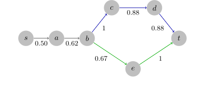 Figure 3. An unattackable shortest path from s to t in the Flickr dataset. Optimal path: (s, a, b, e, t). Target path: (s, a, v, c, d, t). The cost on (b, c, d, t) is larger than the number of edges on (b, e, t), and the attacker cannot fool the algorithm to play the target path