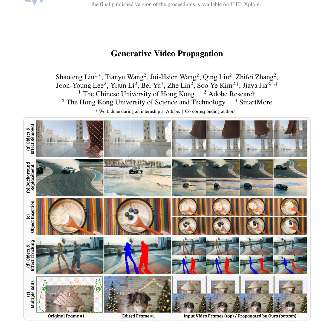 Figure 1. GenProp. We propose a generative video propagation framework (GenProp), which can seamlessly propagate any first frame edit through the video. GenProp supports a wide range of video applications, including (a) complete object removal with effects such as shadows and reflections, (b) background replacement with realistic effects, (c) object insertion where inserted objects have physically plausible motion (i.e., blueberries falling while spoon goes up), (d) tracking of objects and their associated effects, and (e) multiple edits (outpainting, insertion, removal) at a single inference run