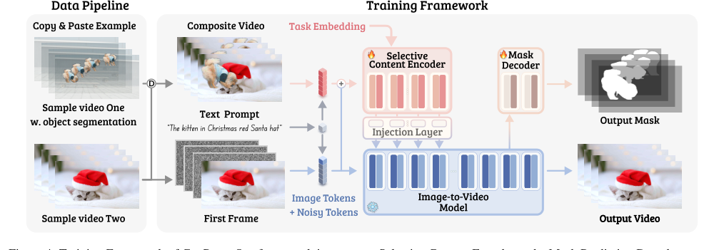 Figure 4. Training Framework of GenProp. Our framework integrates a Selective Content Encoder and a Mask Prediction Decoder on top of the I2V generation model, enforcing the model to propagate the edited region while preserving the content in the original video for all other regions. With synthetic data augmentations and task embeddings, our model is trained to propagate various changes in the first frame