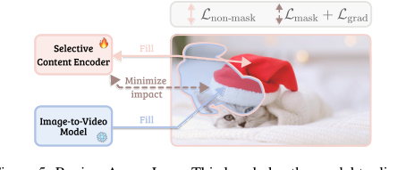 - SCEの選択性を強制する: $\mathcal{L}_{\text{grad}}$ 項は特に巧妙です。入力マスク領域が摂動された場合に特徴が変化する場合にSCEを罰することにより、編集された領域に関するSCEの出力の特徴に対して「平坦な」損失ランドスケープ領域を作成します。これにより、SCEは変更に対して不変な表現を学習することを強制され、実質的に編集に対して「盲目」になります。これにより、SCEの役割(元のコンテキストのエンコード)とI2Vモデルの役割(編集の伝播)が分離され、ゴーストや削除されたオブジェクトの再出現のような問題が防止されます。これがなければ、SCEはどこでも元のコンテンツを再構築しようとする可能性があり、変更の伝播を妨げる可能性があります。