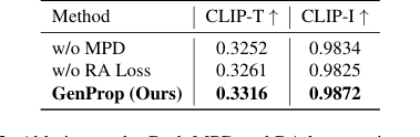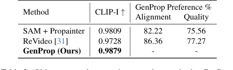 Table 2. Object removal comparison to other methods. GenProp outperforms baselines on consistency, alignment, and quality