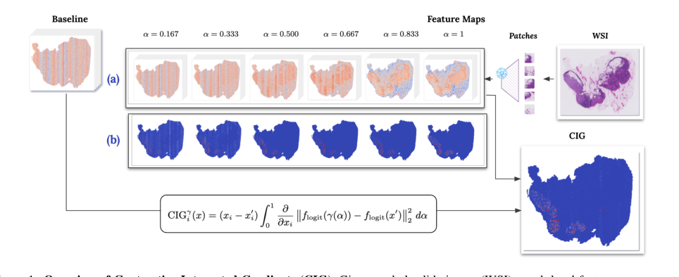 Figure 1. Overview of Contrastive Integrated Gradients (CIG). Given a whole-slide image (WSI), patch-level features are extracted and compared to a baseline sampled from non-tumor regions. An interpolated path \ga m ma (\a lpha ) = x + \alpha (x' - x) is constructed between the input x and the baseline x' . CIG computes attributions by integrating the gradients of the squared logit difference along this path, where f_{\text {logit}}(\cdot ) denotes the model’s logit output and \ | \cdot \|_2 is the Euclidean norm. Row (a) shows interpolated features at different \alpha values ( \ alpha = 0.167 to 1 ). Row (b) illustrates how contrastive gradients evolve with increasing \alpha , indicating the sensitivity of each feature at each interpolation step. The full attribution is computed by summing the gradients across all \alpha values and multiplying by the input difference x - x' . The final heatmap (bottom right) shows the CIG attribution result, indicating which regions most strongly influence the model’s decision relative to the baseline