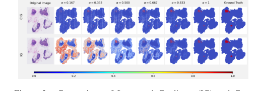 Figure 2. Comparison of Integrated Gradients (IG) and Con- trastive Integrated Gradients (CIG) across interpolation steps ( \alpha ), each row shows intermediate gradient maps at increasing \alpha val- ues, from 0.167 to 1.0, illustrating how gradients evolve along the interpolation path. Note that the final heatmap ( \ alpha = 1 ) shows only the gradient at the last step and is not the complete attribution result. The full attribution is computed by summing the gradients across all \alpha values and multiplying by the input difference x ' - x . CIG produces more stable and localized gradients in tumor regions throughout the path, while IG exhibits more dispersed patterns