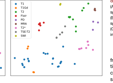 저자들은 의료 영상 도메인 간의 복잡하고 계층적인 관계를 포착할 능력이 부족하기 때문에 원-핫 인코딩과 정렬되지 않은 텍스트 인코더(예: BioBERT)를 명시적으로 거부한다. 원-핫 인코딩은 본질적으로 확장 불가능하고 유사하지만 구별되는 시퀀스 간의 의미론적 거리를 표현하지 못하기 때문에 거부되었다. BioBERT는 텍스트를 이해하지만, 그 텍스트를 의료 영상의 시각적 특징과 본질적으로 정렬하지 않기 때문에 거부되었다. 대조적으로, DCLIP 접근 방식은 텍스트와 영상 특징이 공유되고 응집력 있는 공간으로 매핑되도록 보장하며, 이는 모델이 훈련 중에 해당 특정 도메인을 전혀 접하지 않았더라도 특정 시퀀스가 어떻게 보여야 하는지를 "이해"하는 데 필수적이다.