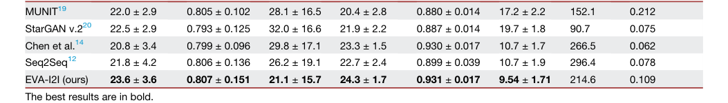 본 논문에서 제공된 증거는 상당히 설득력이 있다. 정량적 결과(표 1)는 EVA-I2I가 내부 도메인 및 외부 도메인 데이터셋 모두에서 기준선 모델보다 일관되게 우수함을 보여준다. 특히, EVA-I2I는 경쟁사보다 훨씬 더 나은 합성 성능($p < 0.05$ for PSNR and LPIPS)을 달성했다.