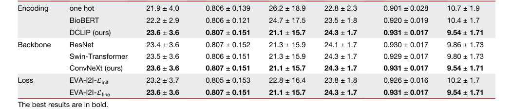 Table 2. illustrates the quantitative results of the ablation study on domain encoding, model backbone, and training loss function. We compare three domain encodings to equip our EVA-I2I, including one hot,12 BioBERT,35 and DCLIP (proposed). BioBERT encoding can extract semantic information from medical prompts, leading to better synthesis results than one- hot encoding, and our proposed DCLIP encoding aligns text and images, making its synthesis performance significantly (p < 0:05 for PNSR and LPIPS) better than BioBERT encoding, which cannot align text and images. We also compare three model backbones of the structure encoder EΦ in EVA-I2I, including ResNet,36 Swin-Transformer,37 and ConvNeXt (pro posed). The ConvNeXt backbone slightly outperforms other methods. Moreover, we also evaluate the effectiveness of cross-dataset collaborative learning. Results show that the model trained with Lfine significantly (p < 0:05 for PNSR and LPIPS) outperforms the model only trained with Linit
