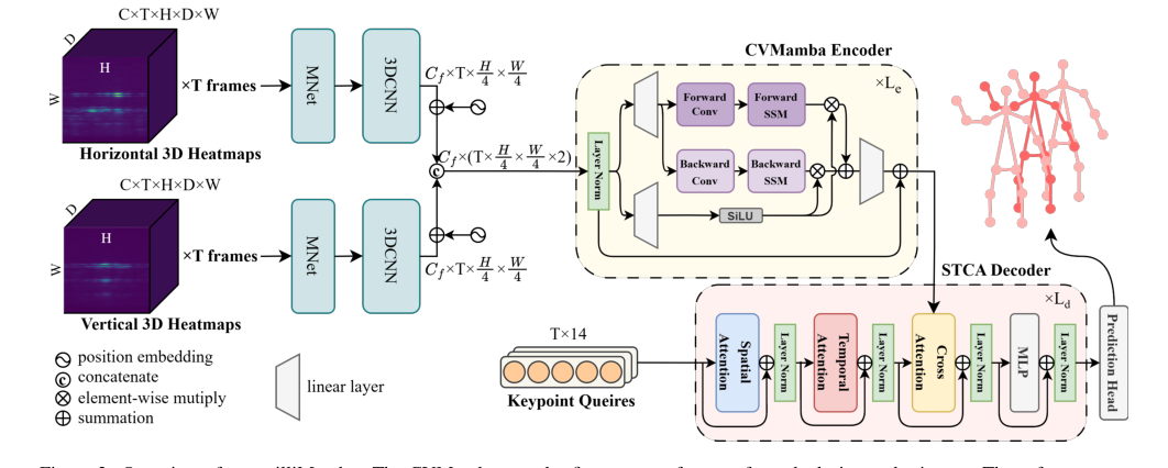 Figure 2. Overview of our milliMamba. The CVMamba encoder first extracts features from dual-view radar inputs. These features are then passed to the Multi-Pose STCA decoder, which progressively refines a set of keypoint queries to produce pose predictions