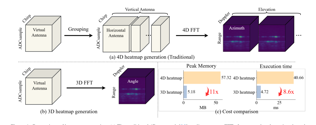 Figure 4. Comparison of heatmap generation. (a) The traditional 4D approach [25] applies separate FFTs for range, doppler, azimuth, and elevation after antenna grouping. (b) Our 3D pipeline performs a unified spatial FFT without grouping, yielding a compact representation. (c) Cost comparison between 4D and 3D heatmaps, showing 11× reduction in memory and 8.6× reduction in latency