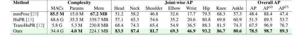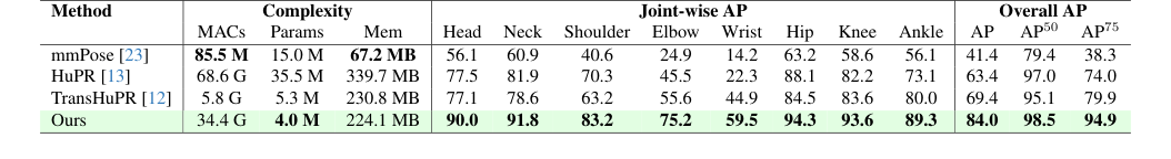 Table 2. Comparison of model performance and complexity across methods on the TransHuPR dataset [12]. The complexity excludes radar signal preprocessing