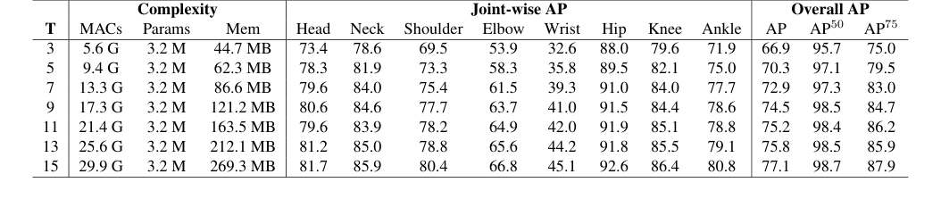 Table 6. Impact of input sequence length (T) on pose estimation performance. We investigate the effect of varying T to understand how temporal context contributes to accuracy