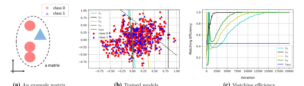 Figure 2. Experimental results from synthetic data. (a) An example matrix is illustrated. (b) The level sets of the trained models are drawn over the data scatter plot. (c) Matching efficiencies (evaluated on a test data set) for each of the loss functions are shown
