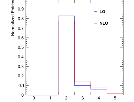 Figure 4. Histograms for the number of generator-level additional b-jets in simulated t¯tb¯b events at both the leading order (LO) and the next-to-leading order (NLO). Note that most events have two additional b-jets (82.8% for LO and 77.4% for NLO)