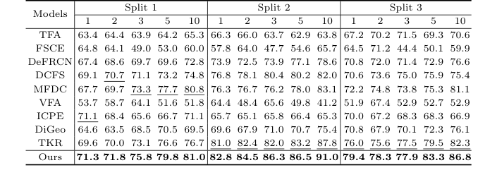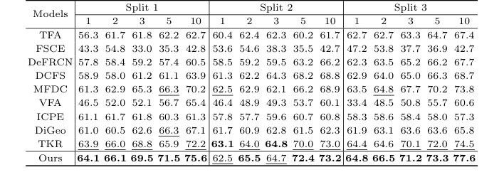 "희생양"은 TFA, FSCE, DeFRCN, TKR과 같은 강력한 모델을 포함한 9개의 최첨단 Few-Shot Object Detection 기준선이었습니다.