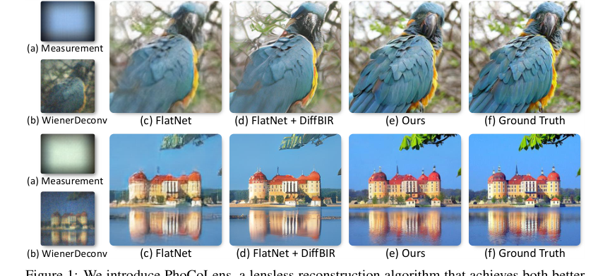 Авторы PhoCoLens столкнулись с фундаментальной дилеммой в безлинзовой визуализации: как достичь как высокого визуального качества (фотореализма), так и точного представления исходной сцены (согласованности). Традиционные передовые (SOTA) методы, такие как стандартные методы деконволюции, например WienerDeconv, оказались недостаточными, поскольку они производили изображения со значительно деградировавшим визуальным качеством, лишенные богатых деталей, необходимых для фотореализма (рис. 1b). В то время как обучаемые подходы, представленные FlatNet-gen, улучшали визуальное качество, они все еще испытывали трудности с восстановлением критически важных высокочастотных деталей, что приводило к менее резким и менее реалистичным изображениям (рис. 1c).