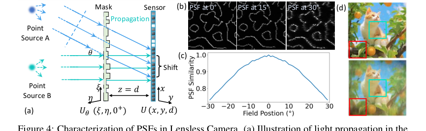 Figure 4. Characterization of PSFs in Lensless Camera. (a) Illustration of light propagation in the lensless camera: two point sources A and B at infinity emitting parallel light beams. Source A emits at angle θ relative to the optical axis, causing a PSF shift on the sensor plane This PSF shift depends on both the incident angle θ and the distance d between the sensor and the mask. (b) Simulated PSFs for light sources at angles of 0°, 15°, and 30°. (c) Inner product similarity between the on-axis PSF and off-axis PSFs at different field positions. (d) Reconstruction using PSF at 0°, degradation is more significant at the periphery (red box) than the center (green box)