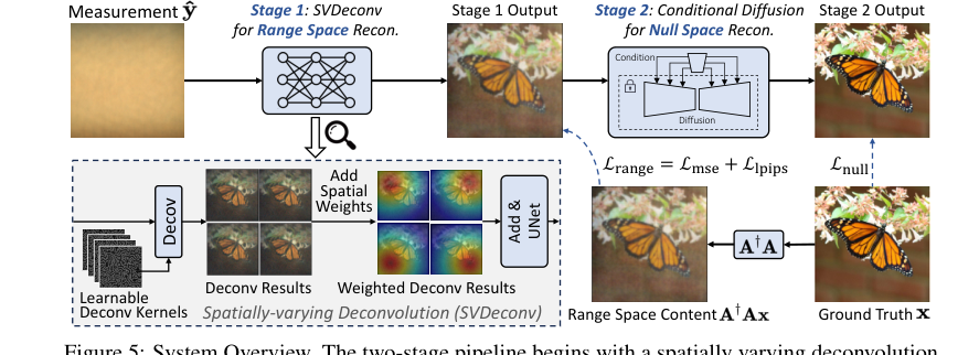 Figure 5. System Overview. The two-stage pipeline begins with a spatially varying deconvolution network mapping lensless measurements to range space. Then a conditional diffusion model for null space recovery refines details using the first stage output, achieving the final reconstruction