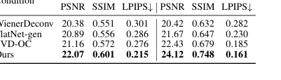 - Условия содержимого пространства образов: Абляция, в которой реконструированное содержимое пространства образов первого этапа было заменено выходами WienerDeconv, FlatNet-gen и SVD-OC (SVDeconv, обученный с исходным содержимым) для обусловливания диффузии второго этапа.