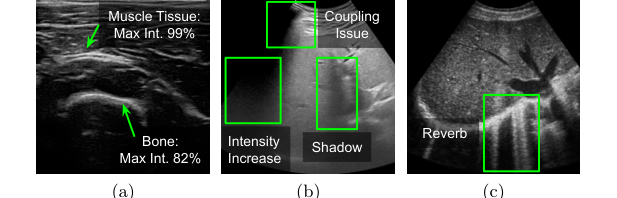 Figure 2. Complex relationship between confidence and pixel intensities. (a): tissue that blocks sound (bone) causing a weaker signal than a tissue that doesn’t block sound (muscle). (b-c): different common ultrasound artifacts
