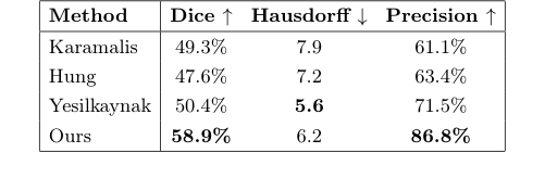 * Hausdorff 距离: 虽然 Yesilkaynak 的方法具有稍好的 Hausdorff 距离(5.6 对我们的 6.2),但整体上优越的 Dice 分数和精确率结果明确证明了我们的置信度图对于此下游任务更有效。