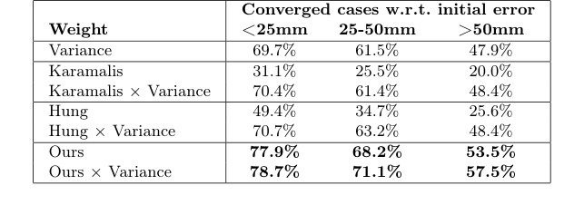 * 收敛案例增加: 在所有初始配准误差类别(<25mm、25-50mm、>50mm)中,“Ours”和“Ours × Variance”始终产生了最高百分比的收敛案例。对于小于 25mm 的初始误差,我们的方法实现了 77.9% 的收敛率(与方差结合时为 78.7%),显著超过了基线“Variance” (69.7%)、Karamalis (31.1%) 和 Hung (49.4%)。即使基线与方差结合(例如,Karamalis × Variance 为 70.4%),我们的方法仍然显示出明显的优势。